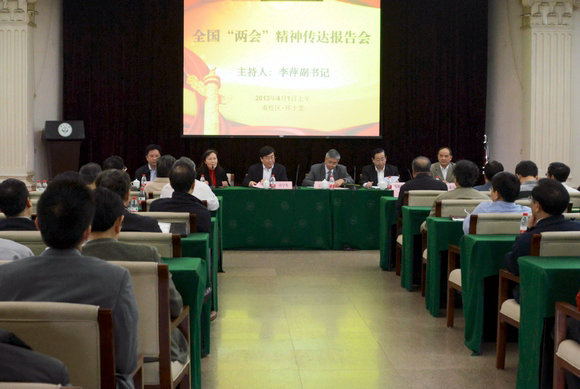 4月1日上午,我校在南校区怀士堂召开传达十二届全国人大一次会议、全国政协十二届一次会议精神报告会。全国人大代表、校长许宁生,全国政协委员王珣章、毛蕴诗、刘昕到会传达全国“两会”精神。校党委书记郑德涛出席并讲话。会议由校党委副书记李萍主持。