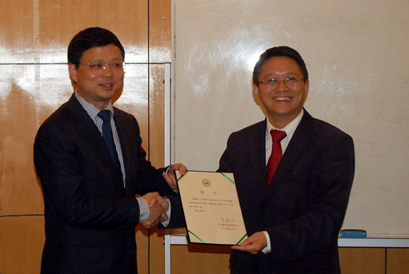 3月20日下午,我校外国语学院举行了一个特殊的聘书颁发仪式。我校87级校友,现任广东省佛山市南海区委常委、组织部部长汤建军先生被外国语学院特聘为职业导师。在同学们热烈的掌声中,汤建军校友从常晨光院长手中接过了聘书,正式成为外国语学院特聘职业导师。学院许东黎书记、常晨光院长出席了仪式。