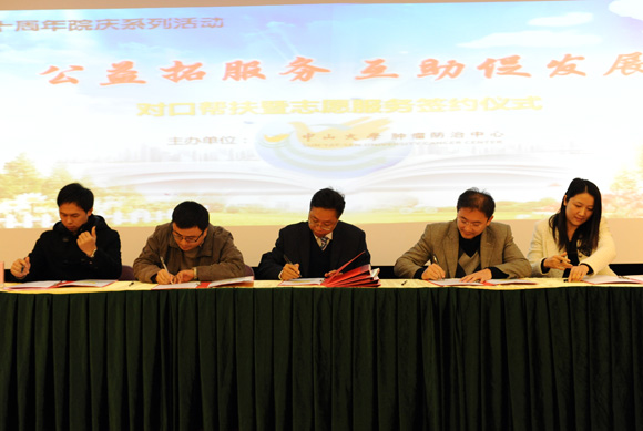近日,我校肿瘤防治中心与五省八家医院签订了新一轮的对口帮扶协议,并与广州市十大高校签订了志愿服务项目。广东省卫生厅副厅长陈祝生、我校副校长黎孟枫、对口帮扶医院代表及中心社会监督员等嘉宾出席了活动,中心党委书记李建超主持仪式。