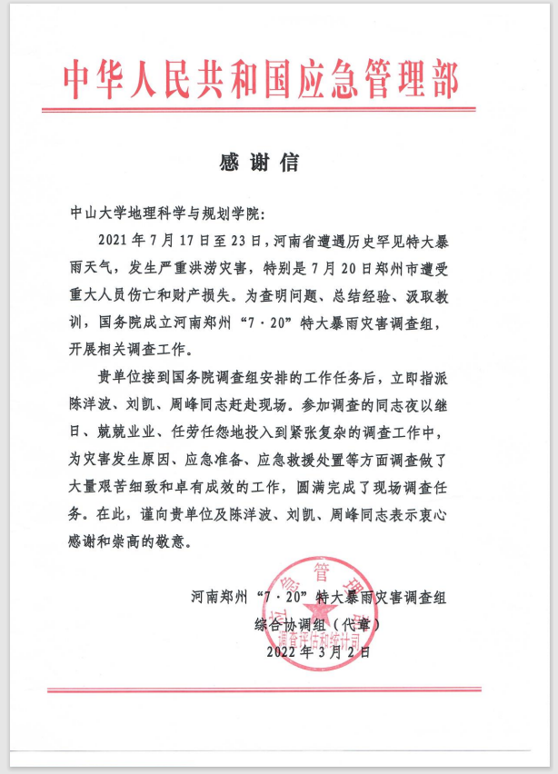 中大新闻网广州6月11电(通讯员谷雨、周峰)近日,bat365在线中国登录入口地理科学与规划学院收到来自国务院河南郑州“7·20”特大暴雨灾害调查组的一封感谢信,信中对于陈洋波教授及其团队为完成委托任务付出的辛勤劳动和成果表示衷心的感谢。
