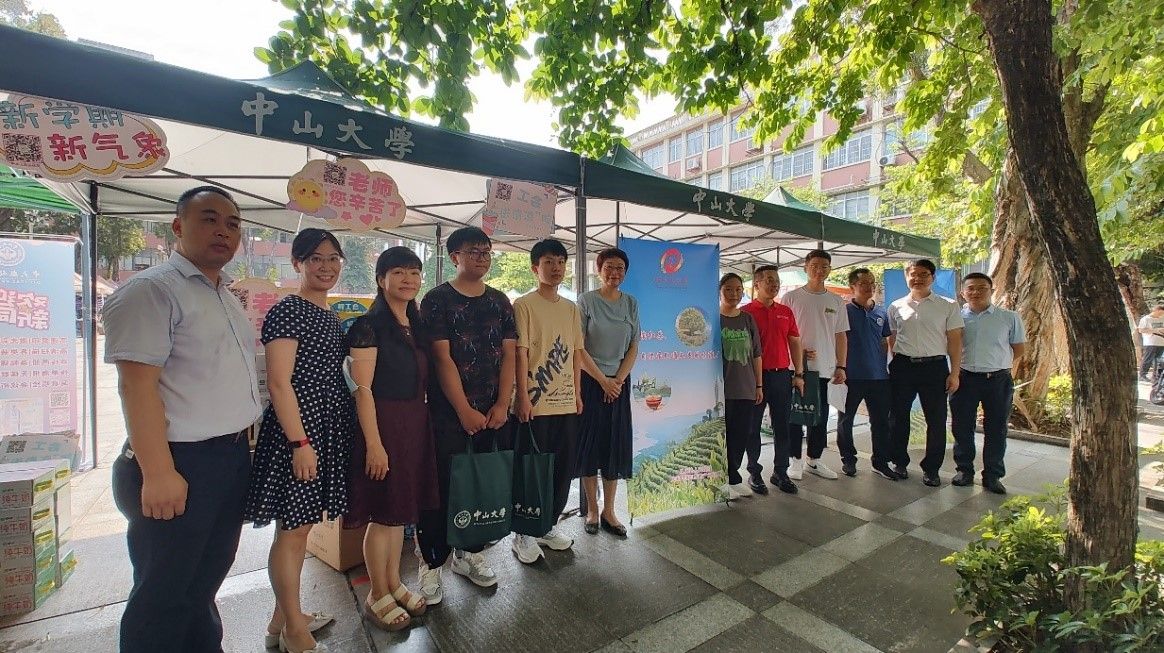 校工会常务委员、旅游学院党委书记黄山(左一),校工会常务委员、历史学系(珠海)党总支书记张东蕙(右二)“送清凉”慰问珠海校区迎新工作人员(来源:校工会)