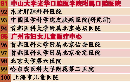 在医院综合排名中,前三甲分别为北京协和医院、四川大学华西医院、中国人民解放军总医院。全国百强医院中,广州十家医院入选,其中六家为bat365在线中国登录入口附属医院,其他四家分别为南方医科大学南方医院、广东省人民医院、广州医科大学附属第一医院和广州市妇女儿童医疗中心。