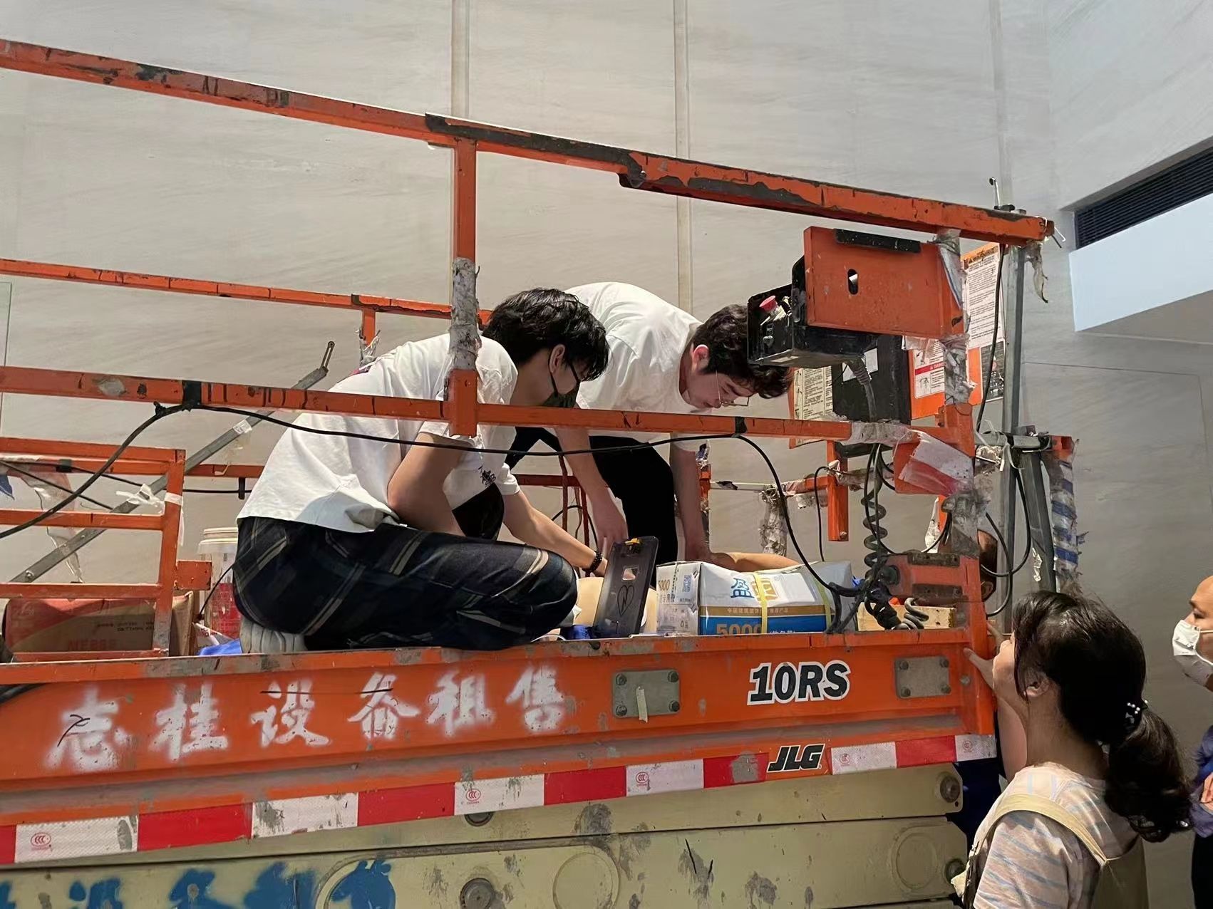 现场已有工友在帮患者做心肺复苏,同学们迅速判断触电工人的生命体征,同时为触电工人清理口腔分泌物,防止分泌物窒息。叶青同学立即为患者进行胸外按压和人工呼吸,韩梦佳同学协助其为病人进行复苏,郭霁峰同学与梁江慧同学马上跑到医学院大楼外取来AED装置。