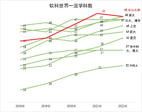 一是多个学科进入国内一流行列。软科学科上榜数从2017年的31个增加至2022年的48个,连续两年位居国内高校第一;泰晤士2022年上榜学科数58个,位列国内高校第一。二是学校的国际竞争力和影响力大幅提高。各类国际评价均稳步提升,部分国际主流排行榜已进入全球前100,居于国内高校“第一方阵”。三是学科广度和水平不断提升。学校共有52个学科参与全国第五轮学科评估,数量创历史新高,其中等次保持和上升的学科占参评学科的94%,文理医工实现齐头并进、全面升级晋档。四是高峰学科不断涌现。生态学、临床医学、工商管理3个学科因首轮“双一流”建设整体建设成效获评“显著”(第一档),被列入新一轮“双一流”建设“一流学科培优行动”候选名单。