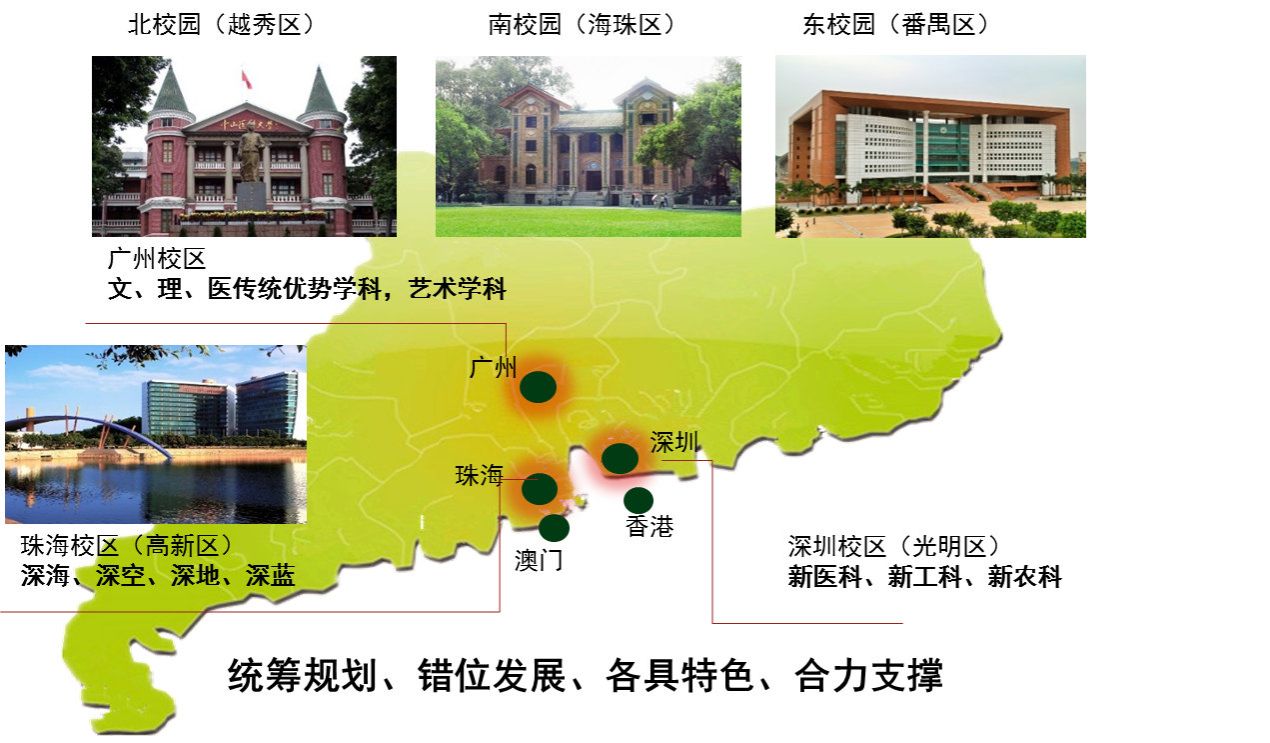 夯实“三校区五校园”办学格局。与珠海、深圳签署协议进一步加强战略合作,完善“三校区五校园”办学格局。广州校区加强文理医传统优势学科、艺术学科;珠海校区聚焦深海、深空、深地、深蓝;深圳校区强化新医科、新工科、新农科。五年来先后新建16个学院,形成“文理医工农艺”综合发展的学科格局。加强宏观规划和顶层设计,编制了学校“十四五”规划和新一轮“双一流”建设方案,为学校未来发展指明方向;学校首轮“双一流”建设成效显著,所有评价指标均位列第一档;学校和11个学科继续入选新一轮“双一流”建设行列;新一轮学科评估取得历史性突破。