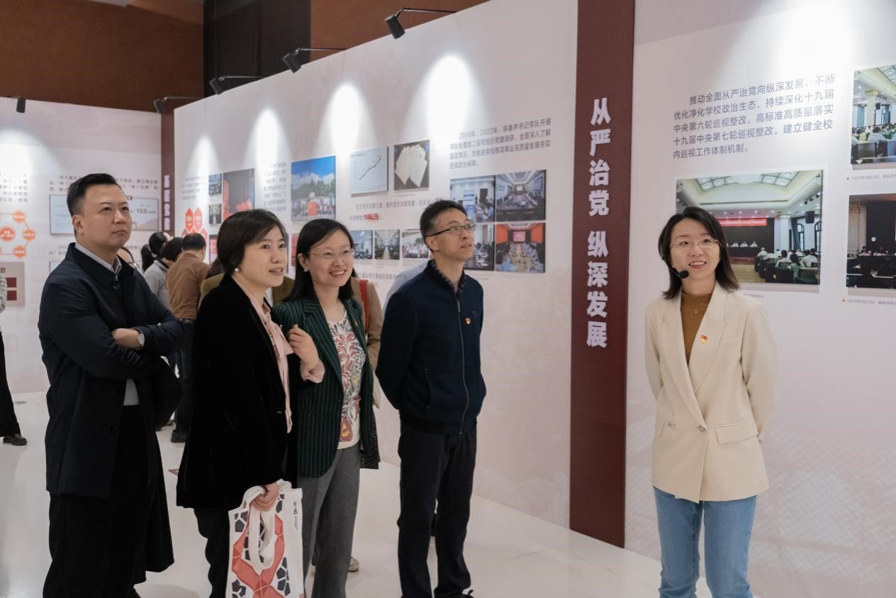 在宣传部沈麟同志的讲解下,党员们细致地参观了主题展览,深入理解了展览的定位、目标和重大意义,更加系统地了解了学校过去五年的发展成就、新局新貌,更加深刻地领悟了学校始终与国家民族同呼吸、共命运的担当与品格,更加全面地感受到学校心怀“国之大者”,加快高质量内涵式发展的决心和斗志。