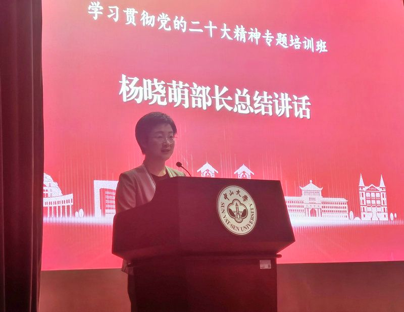 杨晓萌部长在总结讲话中对培训班取得的成效给予了肯定,对学校各部门和二级党组织的配合支持、各学员的积极参与表示衷心的感谢。她对全体学员提出了三点期望:一是继续加强学习,系统全面准确理解党的二十大精神,做到常学常新、常悟常进;二是心怀“国之大者”,牢牢把握中国式现代化的使命任务,为中国式现代化提供坚实人才支撑和智力支撑;三是坚持知行合一,把学习党的二十大精神与贯彻落实学校第十四次党代会精神结合起来,聚力推动学校高质量内涵式发展。她强调,站在迎接百年校庆的历史交汇点,我们要以更加昂扬的姿态、饱满的精神、实干的行动,加快中国特色世界一流大学建设,主动以高质量内涵式发展融入中国式现代化伟大进程,谱写中大新篇章。