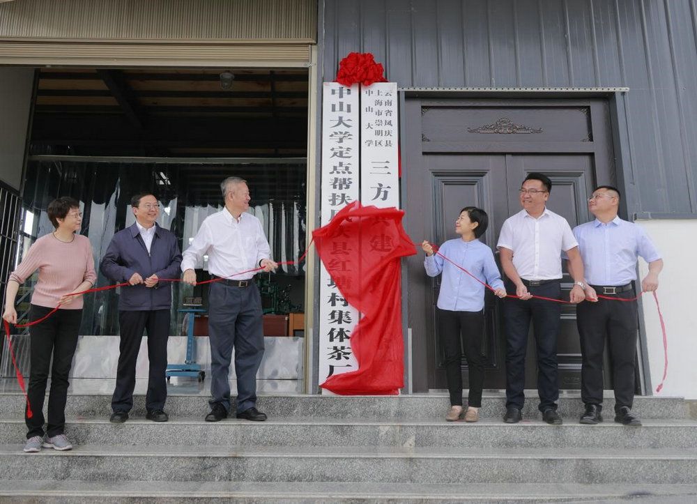 陈春声书记、高松校长、国亚萍副书记为红塘村集体茶厂揭牌(党委宣传部 邱清萌 摄)