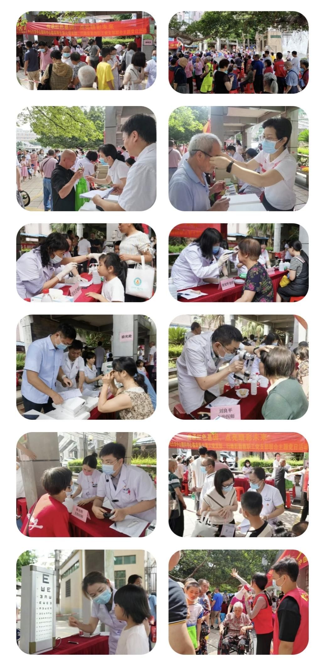 爱眼日健康义诊,为乐昌眼疾患者送去高水平眼科医疗。6月4日上午,党员们前往乐昌职工文化广场准备义诊工作,大家在烈日下有序布置义诊场地,准备医疗器械,摆好义诊药品和科普宣传册。随后,临床师生第六党支部书记郑丹莹、行政后勤教职工党支部书记包海峰等带领40余名医护工作者、后勤志愿者为当地居民开展眼健康义诊咨询服务,为乐昌群众进行视力和眼部检查、眼健康科普以及赠送眼药水等。通过深入浅出地分析病情,给予合理建议,仔细交代用药须知及日常生活注意事项,受到广大群众的热烈好评。本次活动共服务群众约280余名,赠送出眼药水500瓶。活动充分发挥了党员们的专业特长,对强化党员责任担当、发挥先锋模范作用起到了积极作用。