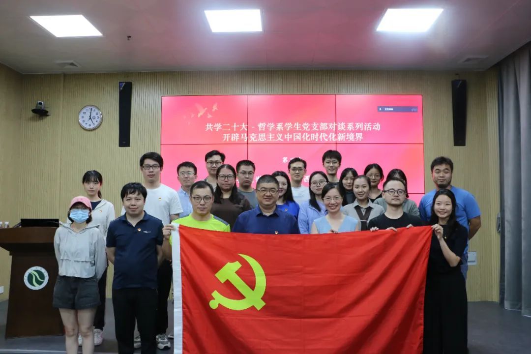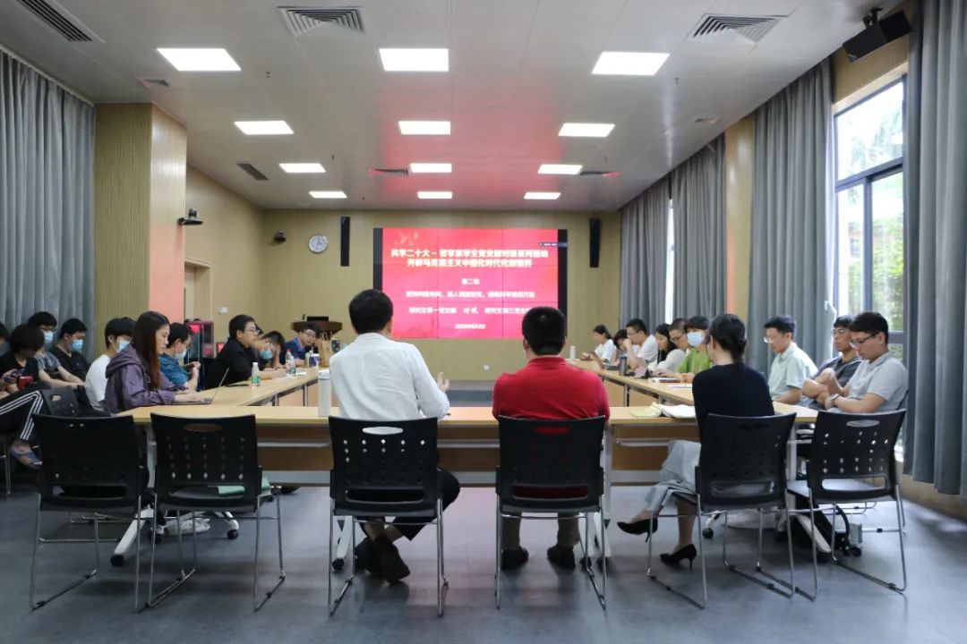 根据活动安排,哲学系党委分别于6月2日和6日,在锡昌堂103会议室组织开展了三场共学对谈。活动开始前哲学系党委副书记王莉婧介绍了举办活动的初衷和意义,并带领大家集中学习了党的二十大报告。