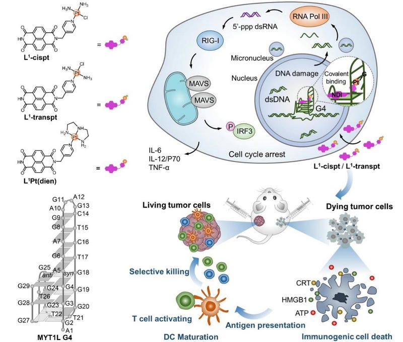作者进一步探索了G4共价结合配体引起的免疫反应行为。L1-cispt和L1-transpt通过增加微核形成和DNA损伤来发挥全基因组效应。G4Del-seq和RNA-seq显示L1-cispt和L1-transpt影响肿瘤通路、胞质DNA感受通路和免疫应答等信号通路。进一步实验表面L1-cispt和L1-transpt激活RIG-I通路,诱导免疫原性细胞死亡(ICD)。使用L1-cispt/L1-transpt处理的细胞作为治疗疫苗能刺激免疫反应,并能有效抑制小鼠体内肿瘤的生长(图1)。与不具有DNA反应性的配体相比,具有DNA反应性的配体有更强的免疫治疗效果,这表明在创新药物设计中,特异性空间识别和共价锁定的合理结合有利于增强药物效力。该工作为G4共价结合铂配合物在免疫治疗中的应用开辟了一条途径。