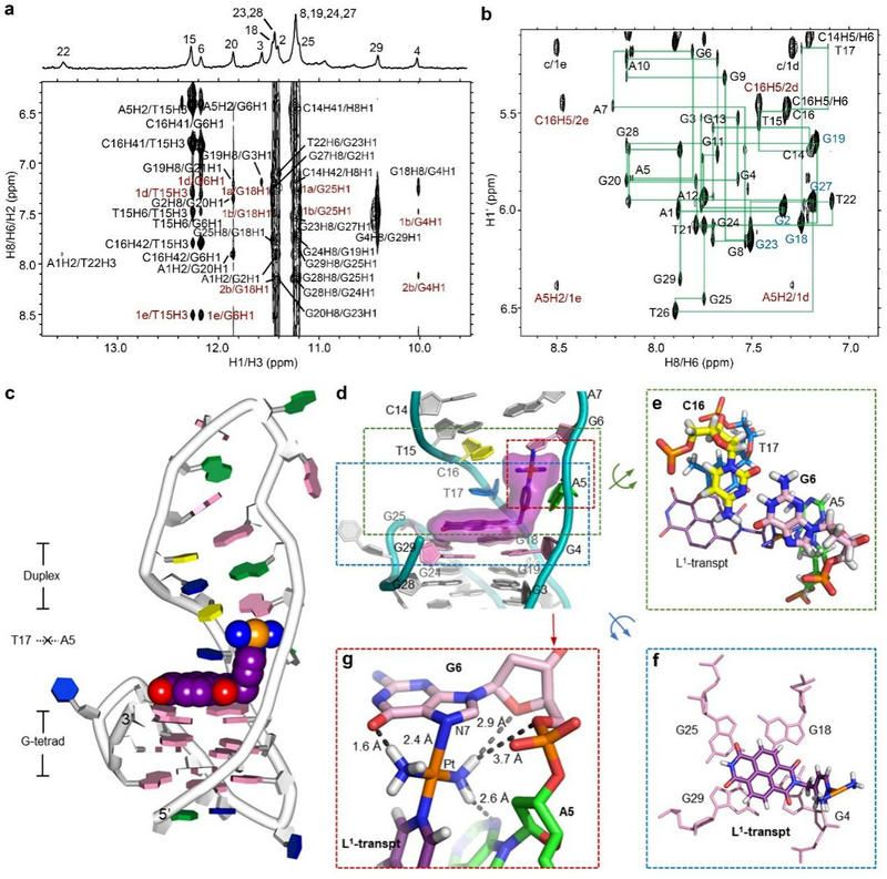 近日,bat365在线中国登录入口化学学院毛宗万教授团队设计了一类由有机配体和铂单元组成的新型有机-铂杂化体(L1-cispt和L1-transpt),通过空间匹配引导与G4结合,同时通过铂单元与G4的共价结合将其锁定在结合位点(图1)。L1-transpt-MYT1L G4复合物的溶液结构表明,当L1-transpt与G4的动态空间结合达到平衡时,L1-transpt破坏了A5-T17碱基对,实现了MYT1L G4中G6残基的N7与铂单元的共价结合,而L1-transpt配体中的有机大平面通过π-π堆积作用结合在G-四分体平面上,这与作者之前报道的弱相互作用引导的空间结合不同(图2)。这是第一个配体与G4共价结合的溶液结构,对G4共价结合配体的设计具有重要意义。