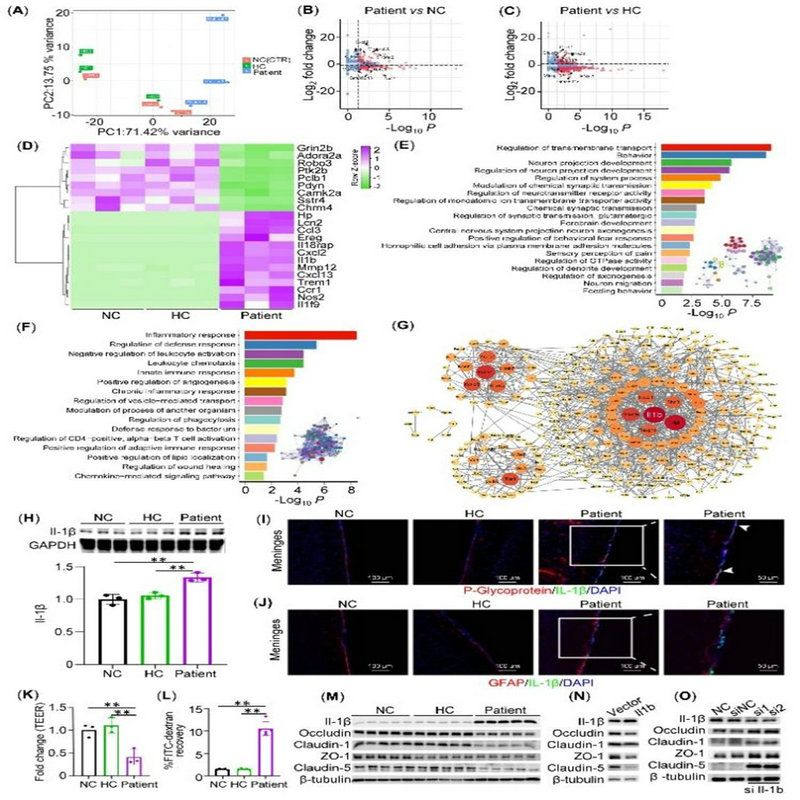 该研究进一步发现,PBMC通过上调BBB内皮细胞IL-1β表达以促进BBB的破坏。研究人员通过转录组学、免疫荧光、蛋白印迹等鉴定了PBMC通过上调IL-1β介导模型小鼠BBB破坏(图3A-J),并在体外BBB模型中对内皮细胞 Il-1β 进行敲除也发现敲除 Il-1β 后BBB破坏明显减轻(图3K-O)。