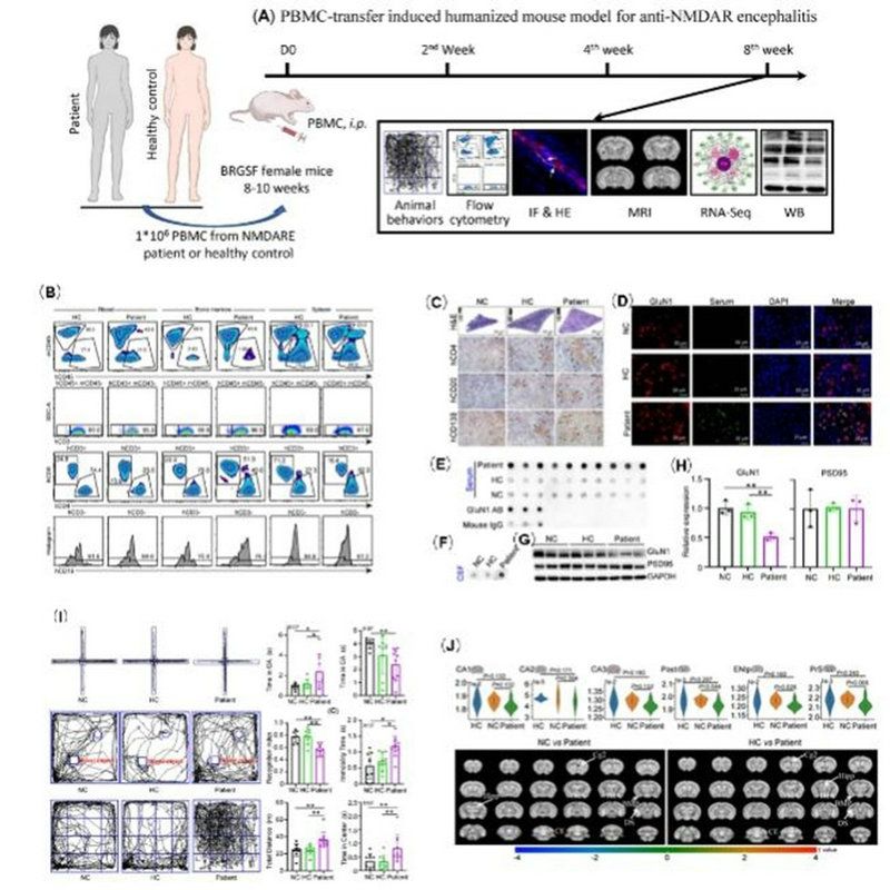 该研究首次构建了PBMC诱导的人源化小鼠模型:课题组分别将抗NMDAR脑炎患者、健康受试者的PBMC(外周血单核细胞)通过腹腔注射至重度免疫缺陷小鼠-BRGSF小鼠中(图1A),人源的免疫细胞可以在小鼠的血、脾、骨髓中存活(图1B),小鼠脾脏形成类似于生化中心的结构(图1C)。而且,实验模型小鼠的血、脑脊液中有抗NMDAR抗体(抗GLuN1抗体)产生(图1D-F),模型小鼠脑组织中GLuN1表达下调(图1G,H);进一步行为学检测还发现模型小鼠精神行为存在异常(图1I);通过9T功能MRI成像也显示实验模型小鼠脑功能紊乱和脑结构轻度萎缩(图1J)。