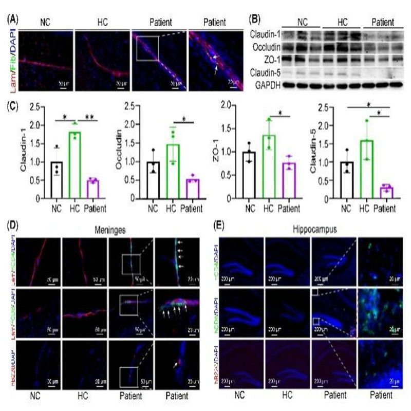 该研究发现,模型小鼠存在明显的血脑屏障(BBB)破坏及紧密连接蛋白如Claudin-1\Occludin\ZO-1\Claudin-5蛋白下调(图2A-C);并发现模型小鼠脑膜中有人B细胞、人T细胞浸润(图2D),且模型小鼠海马存在CD8+T细胞浸润(图2E)。