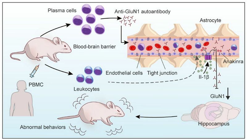 本研究首次构建了PBMC诱导的人源化抗NMDAR脑炎小鼠模型,并进一步从体内、体外实验揭示PBMC通过上调IL-1β促进BBB的破坏进而诱导模型小鼠脑炎发生。该研究不仅阐明了抗NMDAR脑炎潜在的发病机制,也为抗NMDAR脑炎的精准治疗提供了新的靶点,并为下一步开展Anakinra药物临床试验奠定了理论基础。