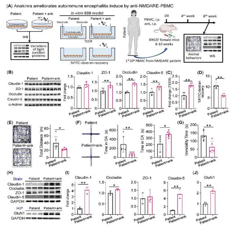 最后,该研究明确了IL-1受体拮抗剂(Anakinra, 阿那白滞素)对BBB的保护作用并可缓解模型小鼠的病情。课题组首次发现,在体外BBB模型上,Anakinra上调紧密连接蛋白ZO-1\Occludin\Claudin-5表达(图4B)及缓解患者PBMC对BBB模型完整性的破坏(图4C,D);在抗NMDAR脑炎人源化模型小鼠上也发现Anakinra可以改善小鼠的精神行为异常(图4E-G)、上调脑组织紧密连接蛋白以及海马组织中GluN1的表达(图4H-J)。