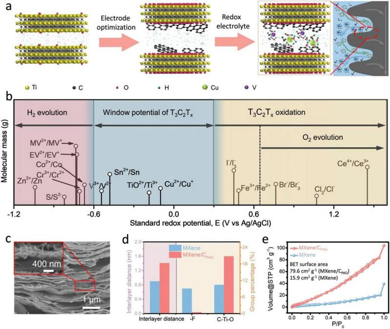 bat365在线中国登录入口材料科学与工程学院衣芳教授课题组围绕解决这三个问题和获得高性能Ti3C2Tx MXene基超级电容器电极材料、器件及应用开展了系列研究。在课题组前期工作所开发的一种节能集成策略制备得到同时具有高电容,高倍率以及高循环稳定性的Ti3C2Tx MXene超级电容器电极(ACS Nano, 2022, 16, 9713−9727)的基础上,进一步根据Ti3C2Tx电极材料特性,首次利用氧化还原电位在Ti3C2Tx的稳定电势窗口内引入氧化还原添加剂来提高Ti3C2Tx基超级电容器电极及器件的电化学性能。