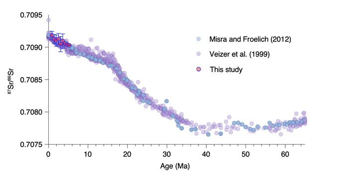 基于以上研究,bat365在线中国登录入口海洋科学学院海洋地质与地球化学研究团队开展了深海沉积物中生物磷灰石的U-Pb年代学研究工作。研究团队获取了具有较好年龄框架的IODP钻孔样品,挑选其中的鱼牙开展了生物磷灰石U-Pb年代学验证。结果表明,IODP钻孔中鱼牙U-Pb定年结果与微体古生物年代在误差范围内一致,说明生物磷灰石U-Pb年代计较为可靠。在此基础上,研究团队将磷灰石U-Pb年代学应用于西太平洋富稀土沉积物样品中,U-Pb定年结果从底部到顶部为6.22百万年到2.16百万年(图3),同时该年代学还得到了鱼牙原位Sr同位素结果的验证(图4),有效证明了该区域内存在一期中新世稀土矿化事件。该方法的成功运用将有助于各个海域的稀土富集时代研究,并揭示沉积物不同深度稀土富集事件。