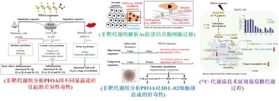 团队提出了非靶向代谢组学可用于评价PFOA因不同暴露途径引起的差异性毒性,发现相同的毒性效应由不同的代谢途径调控(Journal of Hazardous Materials, 2021);运用非靶向代谢组结合转录组学技术,揭示As暴露促进结直肠癌细胞迁移的潜在分子机制(Environment International, 2023)。此外,团队构建了稳定培养14天的三维肝细胞球模型,运用非靶代谢组学分析PFOA暴露后三维肝细胞的代谢谱,观察到PFOA引起三维肝细胞的代谢变化更接近人群流行病学的调查结果(Science of the Total Environment, 2022)。为了示踪代谢通路的变化过程和评价代谢通路活性,团队运用13C-代谢流技术研究PFOA暴露对肝细胞葡萄糖代谢的影响,发现PFOA是通过抑制三羧酸循环代谢,而非糖酵解,造成糖代谢紊乱(Science of the Total Environment, 2021),并且团队以综述论文形式详细介绍代谢流技术和总结了代谢流技术在环境健康中应用(Trends in Analytical Chemistry, 2023)。团队的一系列研究工作表明,环境污染物引起机体代谢谱的变化是环境污染物毒性的一种重要特征,发现的活性代谢物具有减弱环境污染物毒性的能力。综上所述,非靶向代谢组学和代谢流技术是环境健康领域的具有前景的重要研究手段(图3)。