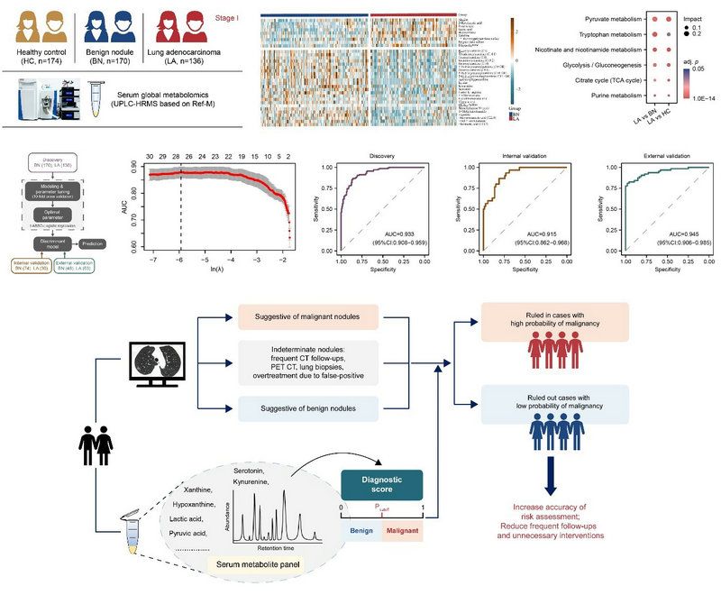 团队进一步与bat365在线中国登录入口肿瘤防治中心及bat365在线中国登录入口中山医学院代谢平台的黄蓬教授、胡寓旻研究员团队合作,利用Ref-M策略找到了早期肺腺癌血清中30多种代谢标志物,揭示了色氨酸代谢在肺腺癌糖酵解活动中发挥了重要作用。研究还直接利用Ref-M校正后的数据建立并验证了一种血清代谢分类器,该分类器在区分LDCT扫描到的肺结节的良恶性中具有高特异性和敏感性,提高了血清代谢标志物在CT结节风险评估中的应用价值,促进了个性化诊断工具的发展。Ref-M方法灵活准确,也为早期肿瘤的精准诊断提供了快速可靠的分析策略(图2)。该论文成果是bat365在线中国登录入口肿瘤防治中心胡寓旻研究员、刘万里主任技师以及生命科学学院栾天罡教授为论文的通讯作者,生命科学学院博士生姚瑶、bat365在线中国登录入口肿瘤防治中心王雪萍副主任技师和bat365在线中国登录入口附属第一医院关键副主任医师为论文共同第一作者。研究工作也得到广东工业大学生物医药学院张晖特聘研究员、bat365在线中国登录入口中山医学院代谢平台俞甜甜老师等合作者的大力支持。(Nature Communications, 2023)