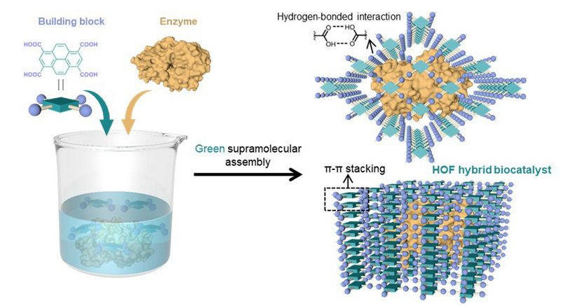 中大新闻网讯(通讯员黄维)天然酶是一类具有催化活性的天然聚合物,通过绿色、温和、高效的方式催化细胞内的生物化学反应,具有人工催化剂无法比拟的高效率。然而,酶的柔性构象在外界刺激下极易发生变化,极大地限制了酶的大规模工业应用。利用多孔超分子“盔甲”对天然酶结构进行约束、保护是设计多功能杂化生物催化剂的有效手段,既能解决酶的稳定性问题,又能提高酶的可重复性。尽管该领域已取得了系列进展,但多孔超分子框架的结晶往往需要苛刻的条件,如何实现在生物相容条件下原位装配超分子晶体“盔甲”仍是技术难点。