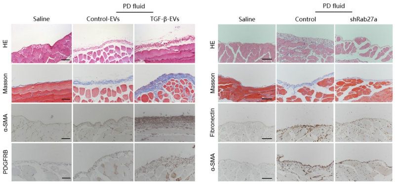 该研究通过对腹膜的单细胞转录组(scRNA-seq)分析和细胞外囊泡(Extracellular Vesicles,EVs)的4D蛋白质组学分析,确定了腹膜间皮细胞是腹透流出液衍生EVs的主要来源细胞,证实了EVs介导腹膜间皮细胞对成纤维细胞的激活作用调控腹膜纤维的形成,从全新的角度解析了腹膜透析相关腹膜纤维化的发生机理,为全新治疗策略的开发提出了可能性。