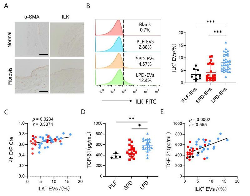 最后,研究者发现ILK在纤维化的腹膜组织中表达上调,ILK阳性EVs的比例在长期腹膜透析患者的腹透流出液中升高。ILK阳性EVs的比例与腹膜功能和TGF-β1的表达水平呈正相关。这些结果表明ILK阳性的EVs可能是预测腹膜透析患者腹膜功能失调和纤维化发生的潜在生物标志物(图3)。