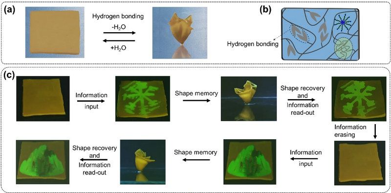 该团队将软物质水凝胶的形状记忆效应(图4a,b)与超分子作用相结合,实现了双重加密。该水凝胶被折叠成三维结构(如玫瑰花)时,经适当脱水可固定临时形状,并隐藏PBG表面包含的N-CD墨水图案或文字信息;当水凝胶吸水溶胀时,临时形状解除,恢复到初始的薄片形状,其隐藏的信息在紫外线下得以解密。有趣的是,用PA溶液可以擦除雪花图案,在已擦除的PBG表面可以涂抹新的信息,然后还可折叠成临时形状。这种加密、形状记忆、恢复、擦除和重新加密周期可以重复多次。结果表明,这种超分子策略可以提高信息加密的灵活性和通用性,有利于拓宽信息加密的应用范围。