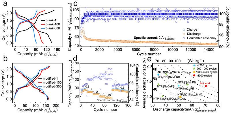 基于这种新颖的表面改性手段,正极分别在0.5 A g−1和10 A g−1的电流密度下展现了157 mAh g−1和125 mAh g−1的比容量,平均工作电压近1.4 V。将该正极与PTCDI有机负极材料组装水系钠离子全电池,能量密度高达94 Wh kg−1,并在2 A g−1的电流密度下进行15000次充放电循环后容量持有率达73.4%。该项工作在循环寿命(此前普遍低于3000个循环周期)和能量密度(通常低于60 Wh kg−1)两项关键指标方面,均取得了重要突破(见图2)。评审专家对该工作给予了高度评价,认为“这是一项关于提升水系钠离子电池锰基普鲁士蓝正极材料稳定性的非常有意思和重要的研究工作”。