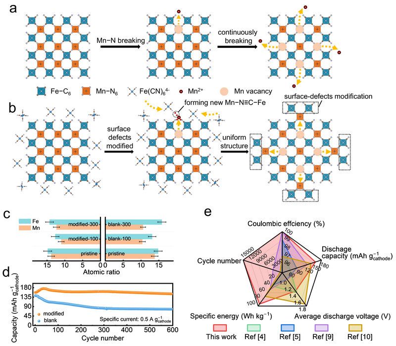 中大新闻网讯(通讯员杨功政)水系钠离子电池由于安全环保、资源丰富等特点,在大规模储能领域展现出巨大的应用前景,是一类具有重要研究价值的二次电池体系。然而,它们的能量密度普遍较低,难以满足电网对大规模储能技术的发展需求。提高材料的质量比容量和平台电压是提升能量密度的关键。在现有的化学体系中,锰基普鲁士蓝(Na2MnFe(CN)6,下文中简称为NaMnF)具有最高的工作电压(3.5 V vs. Na+/Na)和理论比容量(约160 mAh g−1),是一种理想的水系钠离子电池正极材料。遗憾地是,NaMnF同样面临锰基储能材料的共性关键问题,即姜泰勒效应引起不可逆晶格畸变造成锰的溶解,最终导致循环稳定性能变差。如何有效抑制或缓解姜泰勒效应的负面影响,成为当前水系钠离子电池领域最大的科学难题之一。