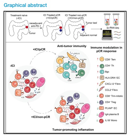 既往研究表明,PD-1单抗的疗效在很大程度上取决于肿瘤免疫微环境。在肺癌、肾癌等领域研究发现肿瘤内CD8 T细胞状态具有巨大异质性,而这些异质性与免疫治疗的疗效相关。此外,免疫治疗不仅能引起CD8 T细胞的状态改变,还能引起免疫微环境中的其他免疫细胞及非免疫的基质细胞改变。然而,肠癌免疫治疗前后的免疫微环境重塑及其对免疫治疗疗效的影响仍不明确。