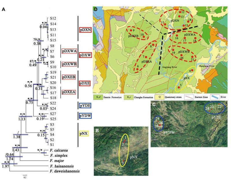 近日,该研究以“The origin and dispersal of Firmiana danxiaensis among isolated specific landscapes”为题在学术期刊Journal of Systematics and Evolution上在线发表。bat365在线中国登录入口是本文的第一作者单位,bat365在线中国登录入口生命科学学院凡强副教授及bat365在线中国登录入口地球科学与工程学院黄康有副教授为论文共同通讯作者。该研究工作是在周婷副教授主持的“国家公园建设专项”(丹霞山生物多样性科考专项)资助下完成的,广东丹霞山国家级自然保护区、韶关学院、广东石门台国家级自然保护区也参与了本项研究。