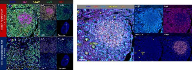进一步研究发现,化疗后CD27+IgD+IgM+ B细胞亚群(ILB)的比例显著富集;并且,组织中ILB细胞的比例与患者的化疗响应性和远期肿瘤控制率密切正相关。接下来,研究者从鼻咽癌患者肿瘤样本中分离出ILB细胞,通过与自体肿瘤来源的T淋巴细胞进行体外共培养等实验,进一步证实GP化疗通过TLR9信号诱导ILB,ILB通过ICOSL-ICOS信号轴激活PI3K/AKT/mTOR通路促进TH1和TFH的扩增,从而增强CTL细胞的杀伤功能。此外,空间上,ILB化疗后聚集形成niche,与T细胞密切接触,并且ILB niche周围的Ki67+ T, TH1, TFH和CTL的浸润水平显著高于其他区域。有意思的是,ILB与这些效应T细胞聚集形成的结构同时表达MECA-79, CD21,CD20,CD3等经典的三级淋巴结构的标记,但缺乏生发中心。