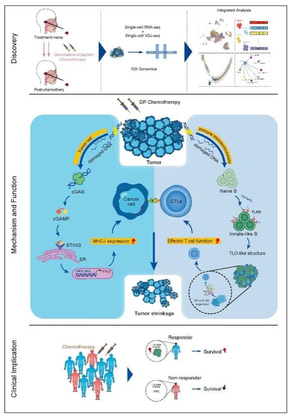 该研究发现,GP化疗介导的肿瘤细胞DNA片段释放可通过Toll-like receptor 9(TLR9)信号诱导CD27+IgD+IgM+先天样B细胞亚群(innate-like B cell, ILB),该亚群定位于化疗诱导的类三级淋巴样结构中,通过ICOSL-ICOS信号轴促进I型辅助性T细胞(TH1)和滤泡辅助性T细胞(TFH)的扩增,进而促进细胞毒性CD8+ T细胞(Cytotoxic T Lymphocyte, CTL)的杀伤功能;与此同时,其还可激活肿瘤细胞的STING-type-I-interferon通路,进而上调肿瘤细胞主要组织相容性复合体(major histocompatibility complex, MHC)class I的表达。二者形成环路,最终,激活的免疫系统有效识别和杀伤鼻咽癌细胞。这项研究阐明了化疗免疫调节作用的新机制,提出了以B细胞为核心的抗肿瘤免疫网络新理论,研究结果将为建立鼻咽癌化疗联合免疫治疗新策略提供重要理论依据。