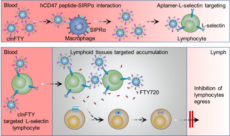 此外,为延长药物的作用时间,研究人员对FTY720进行CD47的修饰,并在治疗的同时加入了生酮饮食。CD47可以和巨噬细胞膜表面受体SIRPα结合,释放“别吃我(Don’t eat me)”信号,防止外周血中巨噬细胞对FTY720的吞噬清除作用,从而延长FTY720在体内的存留时间。而生酮饮食促进了归巢T细胞对FTY720的摄取,能增加药物在淋巴结的富集。人源化小鼠EAE模型实验表明,该治疗方式一次给药即可在42天内持续降低外周T细胞的比例和炎症因子水平,有效控制疾病进程,且对各器官无病理性损伤,从而解决了药物给药频率高(每日给药)及副作用大等问题。