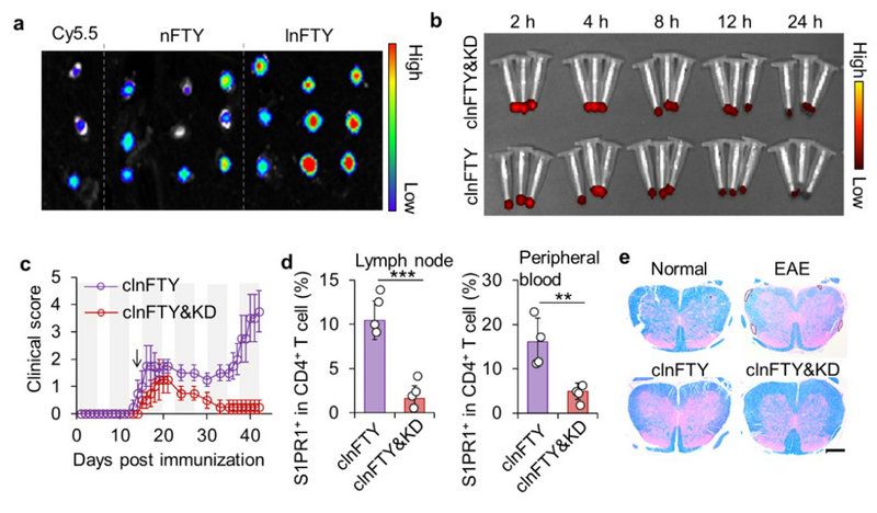 图1 a)FTY720通过L-选择素在淋巴结中富集;b)CD47延长FTY720在体内的循环时间;c)一次给药即可有效减少EAE模型行为学评分,d)降低外周T细胞比例并e)改善中枢神经系统脱髓鞘损伤。