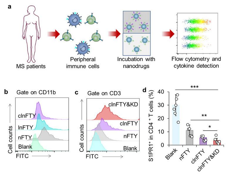 图2 a)MS患者样本处理示意图;b)靶向药物能抑制巨噬细胞的吞噬,c)促进淋巴细胞的摄取,d)从而有效减少T淋巴细胞S1PR1的表达。