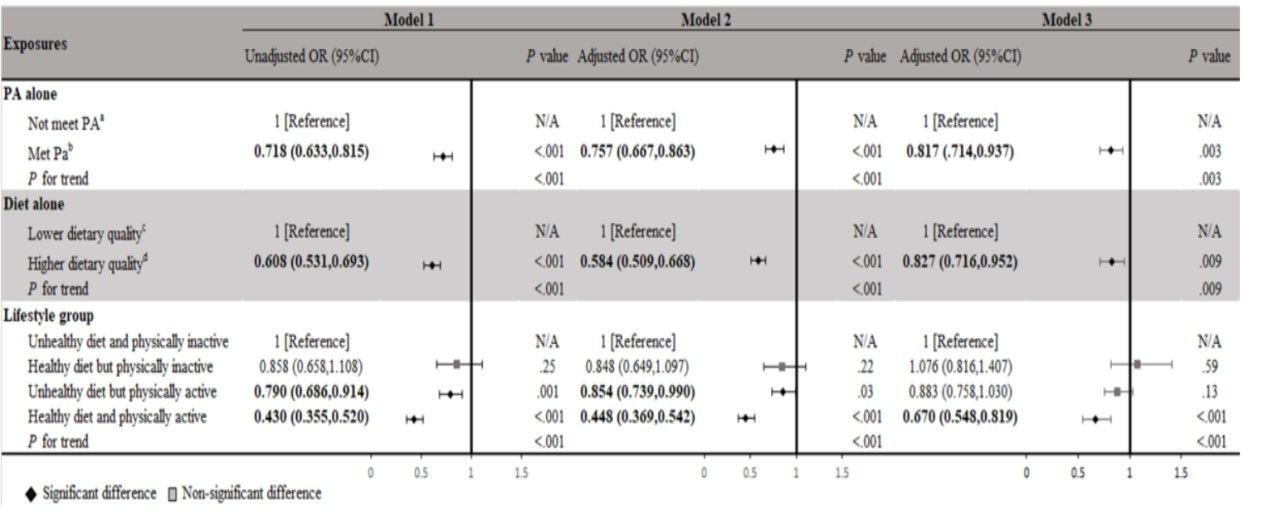 该研究利用2007-2018年NHANES数据,在全美范围内纳入19,295名20~80岁具有代表性的成年人作为研究对象。饮食质量和体力活动量分别利用饮食健康指数(HEI-2015)和总代谢当量(MET/每周)评估。受试者的饮食健康指数高于所纳入样本的第60百分位数,即视为健康饮食;受试者每周的体力活动量达到指南推荐的中等强度体力活动(MPA)时间不少于150分钟或高强度体力活动(VPA)不少于75分钟标准,则定义为积极运动。抑郁症状采用病人健康问卷抑郁量表(PHQ-9)进行诊断。研究发现(表1),相较于不积极运动的个体,积极运动的个体其抑郁症状发生风险降低18%(AOR=0.817, 95%CI: 0.714,0.937)。相较不健康饮食的个体,健康饮食的个体其抑郁症状发生风险降低17%(AOR= 0.827, 95%CI: 0.716,0.952);联合分析发现:与不健康饮食且不积极运动的个体相比,健康饮食并积极运动个体的抑郁症状发生风险降低了33%(AOR=0.670, 95%CI: 0.548,0.819),积极运动和健康饮食存在相加交互作用((RERI=-0.052; 95% CI: -2.149, 2.044),(AP=-0.078; 95% CI: -3.333, 3.177),SI=1.189; 95% CI: 0.001, 1170.880),两者相结合时,协同效应增大。本研究提示,当饮食和运动有任何一项不达标时,都不能有效缓解抑郁症状,而当日常体力活动达到推荐量,同时进行高质量健康饮食时,两者对抑郁症状的协同作用显著增加。该研究发现对成人抑郁症状的饮食、运动干预具有重要借鉴意义。