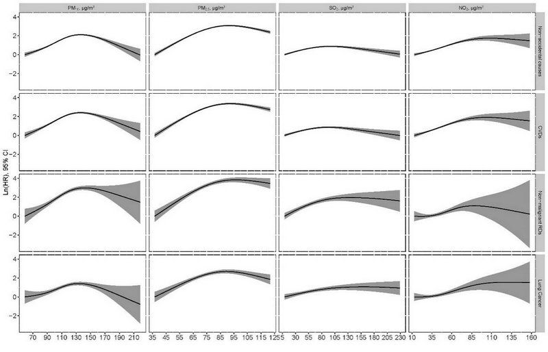 研究发现各大气污染物的长期暴露均可显著增加总非意外死亡,心脑血管疾病死亡,呼吸系统疾病死亡和肺癌死亡的风险,且不论是在空气污染物单独或联合暴露时,各死亡结局的浓度-死亡风险曲线均呈现出单向递增的无阈值线性或超线性形状。此外,此研究基于多污染物模型发现,在纳入模型的四种大气污染物中,PM2.5对各死亡结局风险贡献最高,其次是SO2或PM10。本研究结果将为我国大气质量标准的修订提供重要的科研数据。董光辉教授、汤乃军教授等为该文共同通讯作者。莫纳什大学黄文忠博士、华南环境科学研究所周洋博士,天津医科大学陈曦教授和bat365在线中国登录入口曾晓雯教授为并列第一作者。bat365在线中国登录入口公共卫生学院为第一署名单位。