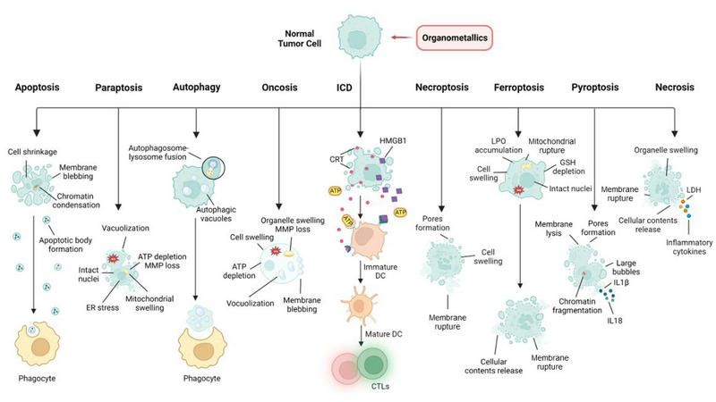 图2 金属有机化合物能够引起的九种细胞死亡方式及相应特点