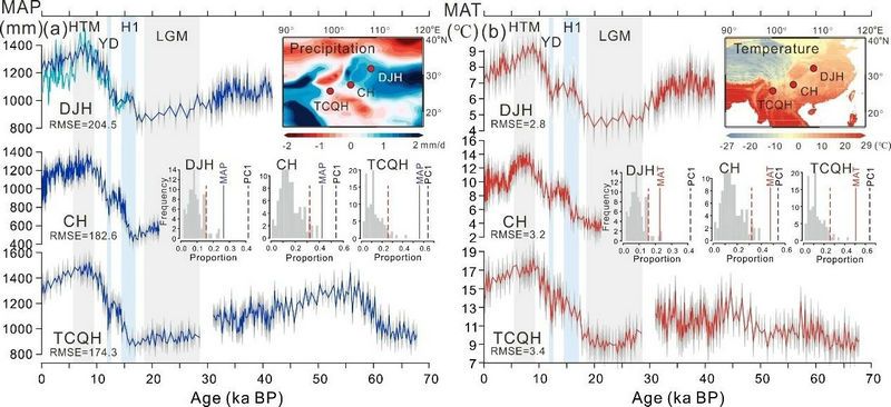 bat365在线中国登录入口地球科学与工程学院的张潇、郑卓、黄康有等与国内外多家科研机构合作,利用最近更新的东亚表土孢粉数据库(EAPD)及亚洲季风区内3个年代尺度达到末次冰期的高分辨率孢粉记录(云南腾冲TCQH、贵州草海CH和湖北大九湖DJH),定量重建了距今6.8万年以来的气候(温度、降水)变化。结果表明: