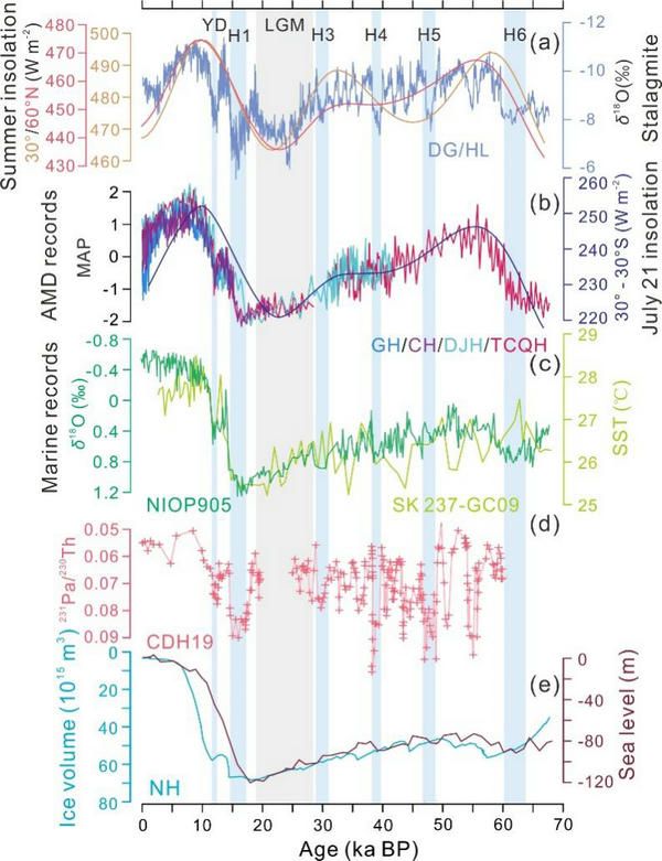 图2. 降水重建结果与半球低纬太阳辐射差、石笋氧同位素、印度洋深海记录、海平面及北半球冰量对比图