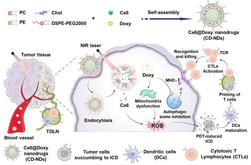 因此,本研究制备了一种脂质体纳米药物,共递送抗生素盐酸多西环素(Doxy)和光敏剂二氢卟吩e6(Ce6),实现肿瘤高效的光动力/免疫联合治疗。Doxy是一种常用抗生素,最新研究发现其还具有抗肿瘤作用。团队的研究进一步发现Doxy可以抑制自噬并诱导线粒体功能障碍。光敏剂Ce6在近红外(NIR)激光照射下,发挥光动力治疗作用,并诱导肿瘤细胞发生ICD,逆转“冷肿瘤”三阴乳腺癌的免疫抑制微环境。而Doxy会诱导线粒体功能障碍,增强光动力治疗效果;同时,Doxy也会抑制肿瘤细胞的自噬活性,从而提高肿瘤细胞表面MHC-I的表达,促进肿瘤抗原的呈递和CTLs的识别,从而提高肿瘤的免疫原性。通过联合Ce6介导的光动力治疗与Doxy诱导的自噬抑制和线粒体功能障碍,实现三阴乳腺癌的高效治疗。本研究所开发的纳米药物显示出良好的抗肿瘤效果,为改善“冷肿瘤”的免疫治疗提供了一种高效的策略。