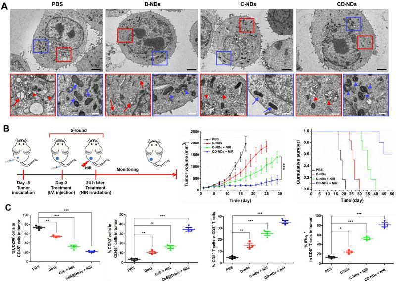 图2、(A)乳腺癌肿瘤细胞接受不同纳米药物处理后的电镜图像。红色线框放大图显示胞内自噬情况,红色实线箭头表示自噬小体,红色箭头表示自噬溶酶体;蓝色线框放大图显示胞内线粒体情况,蓝色实线箭头表示正常线粒体,蓝色箭头表示受损线粒体。(B)纳米药物在乳腺癌肿瘤模型中的治疗方案示意图及不同纳米药物治疗小鼠的平均肿瘤生长曲线和小鼠生存率。(C)通过流式细胞术检测肿瘤组织中的M1型巨噬细胞、TAMs、CTLs和效应T淋巴细胞验证纳米药物治疗后抗肿瘤免疫激活情况。