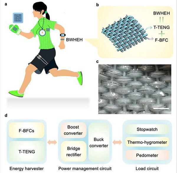 为此,衣芳教授课题组报道了一种由织物型摩擦纳米发电机(T-TENG)和纤维型生物燃料电池(F-BFCs)编织而成的新型透气可编织柔性可穿戴复合式能量收集器件(BWHEH),该器件具有良好的透气性、柔韧性、舒适性。研究设计了匹配和优化TENG和BFC两种器件输出特性的能量管理电路,大大提高了复合式能量收集器件的输出功率,显著降低了有效内部阻抗,实现以稳定的直流电源可持续地为电子设备供电,而且提高了TENG-BFC复合式能量收集器件作为电源的可靠性、稳定性、噪声和精度。详细阐释了TENG-BFC复合的能量管理原理。所设计制备的BWHEH自充电能量管理系统可以通过收集人体运动能和人体汗液能为常见便携式电子设备持续供电。这项工作为能量收集提供了新的途径,并为大功率复合式能量收集器件提供了基础指导。