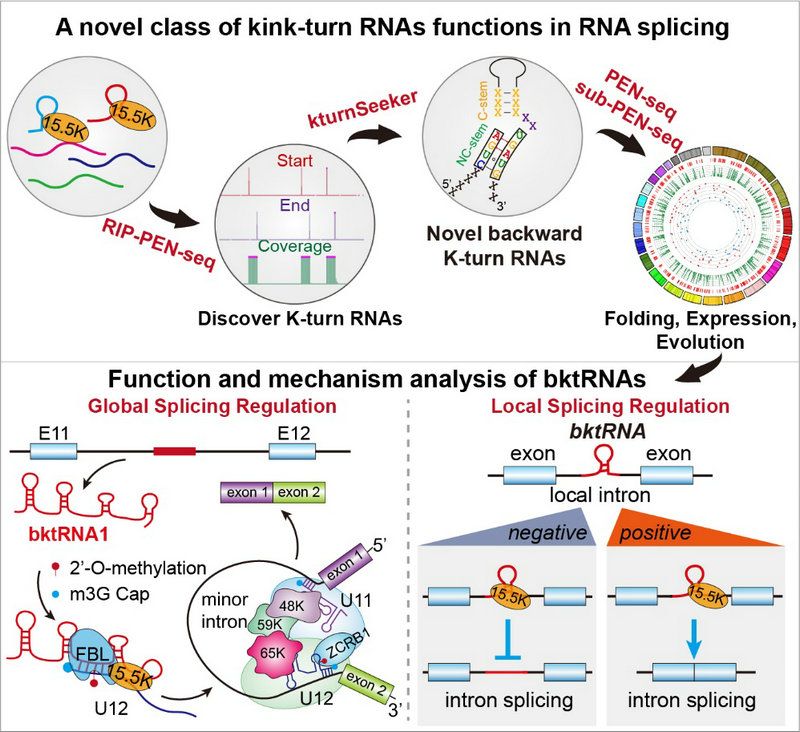 bat365在线中国登录入口生命科学学院的杨建华和屈良鹄教授团队开发了RIP-PEN-seq/PEN-seq/sub-PEN-seq等测序技术和kturnSeeker算法发现在固定位置出现后向(backward)K-turn结构和序列基序的新类型ncRNA(bktRNA),并解析了它们的表达、折叠结构特性及其在RNA剪接和修饰中的功能机制,为发现新的ktRNA/ncRNA及其功能机制研究提供了新方法和新思路。