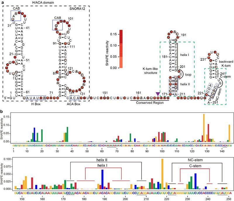 研究团队通过分析保守的bktRNA1基因二级结构的共进化和SHAPE信号值,发现它是一个由后向K-turn结构基序与box H/ACA snoRNA (SNORA12)构成的嵌合ncRNA分子 (图2)。在不同细胞类型中的亚细胞定位分析都发现bktRNA1主要存在于Cajal Body中。同时,通过删除和突变bktRNA1的后向K-turn结构发现后向K-turn结构基序对于bktRNA1的加工、成熟及稳定存在是必不可少的。