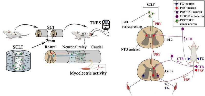 bat365在线中国登录入口中山医学院曾园山教授团队前期研究表明,在全横断脊髓损伤处移植类脊髓组织或组织工程神经网络组织能够作为神经元中继器传递下行的脑源性神经信息到达损伤/移植区以下的脊髓神经环路,可以改善瘫痪后肢的自主运动功能,不过这种运动功能仍有较大的改善空间。这可能与调控后肢自主运动功能的腰段兴奋性运动神经环路没有得到更有效激活有关。此外,曾园山教授团队另一项研究也揭示,应用神经调控技术——尾神经电刺激或电针刺激可以激活全横断脊髓损伤处以下的腰段脊髓神经环路;例如促使腰段神经元合成神经营养素-3(NT-3),增加腰段前角运动神经元的存活和维持其胆碱能神经递质的合成,缓解瘫痪后肢的肌肉萎缩。然而,该研究没有观察到瘫痪后肢的运动功能显著恢复,这可能是与脊髓损伤处没有移植组织工程神经元中继器传递下行的脑源性神经信息到达腰骶段的兴奋性运动神经环路有关。