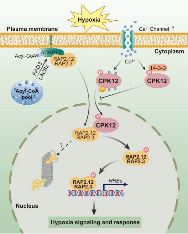 研究表明,低氧诱导植物中多不饱和酰基辅酶A(C18:3-CoA)积累,且C18:3-CoA作为关键脂质信号分子介导ERF-VII与膜锚定蛋白ACBPs的解离和向核转移,调控植物低氧应答,而CPK12对ERF-VIIs稳定性的调控作用则依赖于ACBPs介导的C18:3-CoA信号。进一步研究发现,磷脂酸PA与CPK12高亲和度结合,诱导CPK12在低氧下的核质易位。相反,14-3-3蛋白则通过与磷酸化CPK12互作,抑制CPK12入核,从而负调控ERF-VIIs介导的低氧信号转导(图2)。该研究首次揭示了CPK12-ERF-VII功能模块调控植物低氧感知与信号转导的分子机理,并发现了钙信号由细胞质到细胞核的转导新机制,研究成果对深入理解植物逆境信号应答的调控网络具有重要意义。